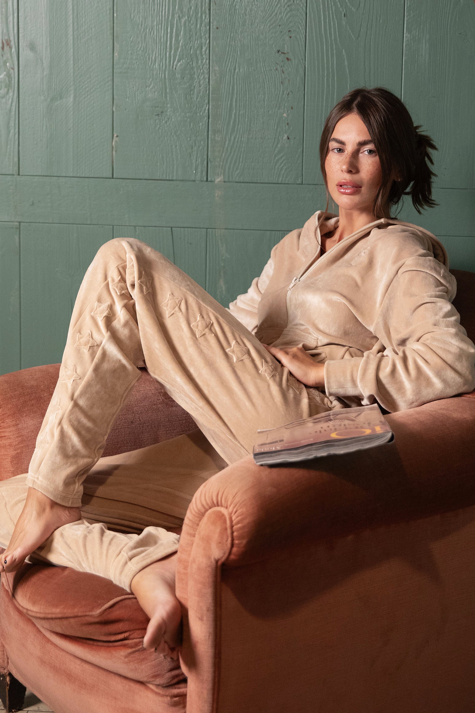 Velour tracksuit, without an elastic waistband, to maintain the softness that only certain garments can offer, the kind of garments that feel like a warm embrace on your body when you wear them.