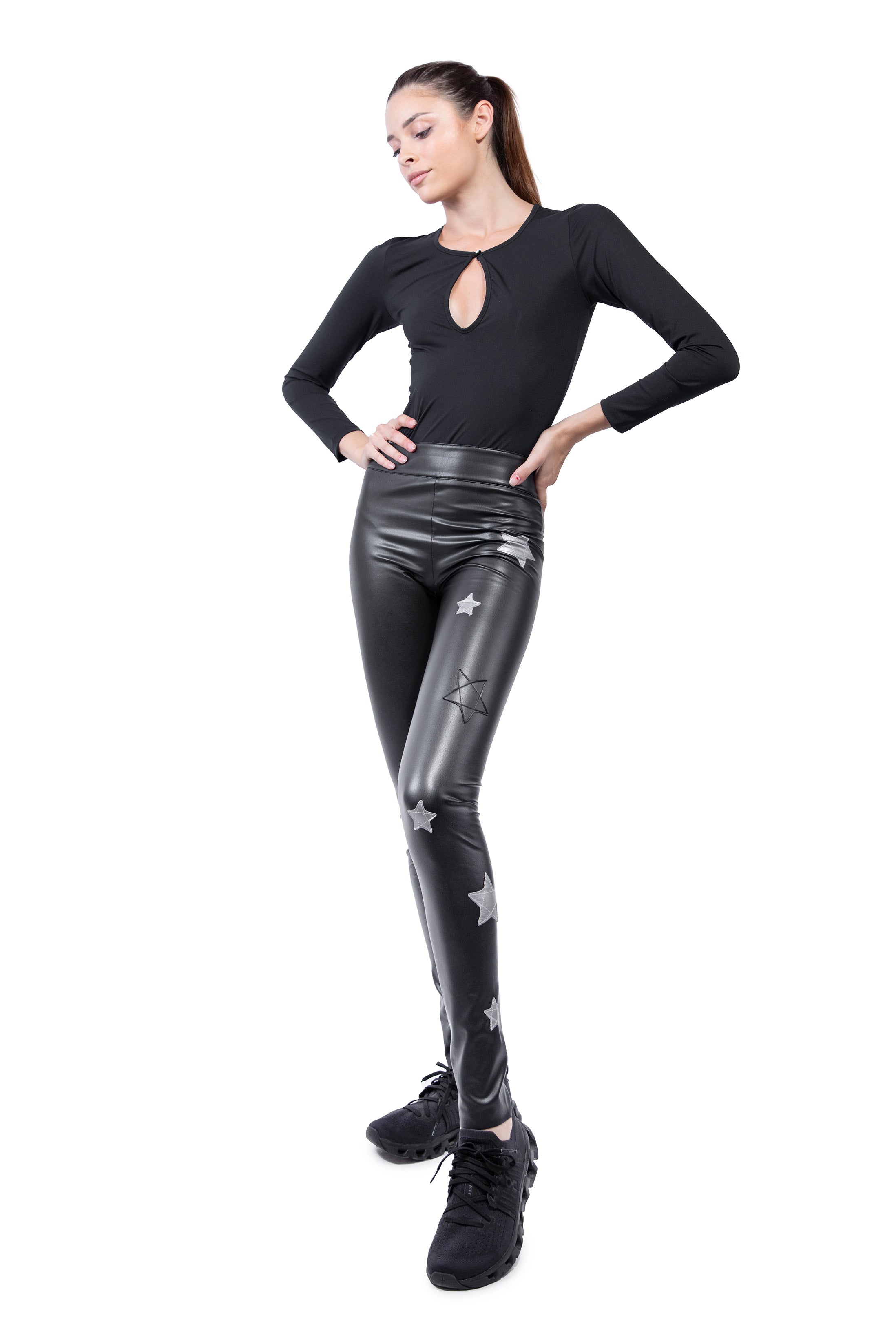Leggings in stretch black eco-leather with a glossy, elegant finish. The slim fit enhances the silhouette, while the tone-on-tone snakeskin-style star applications add character and uniqueness to the piece. Perfect for evening looks or bold outfits, easily paired with elegant tops or oversized sweaters for a casual-chic style.