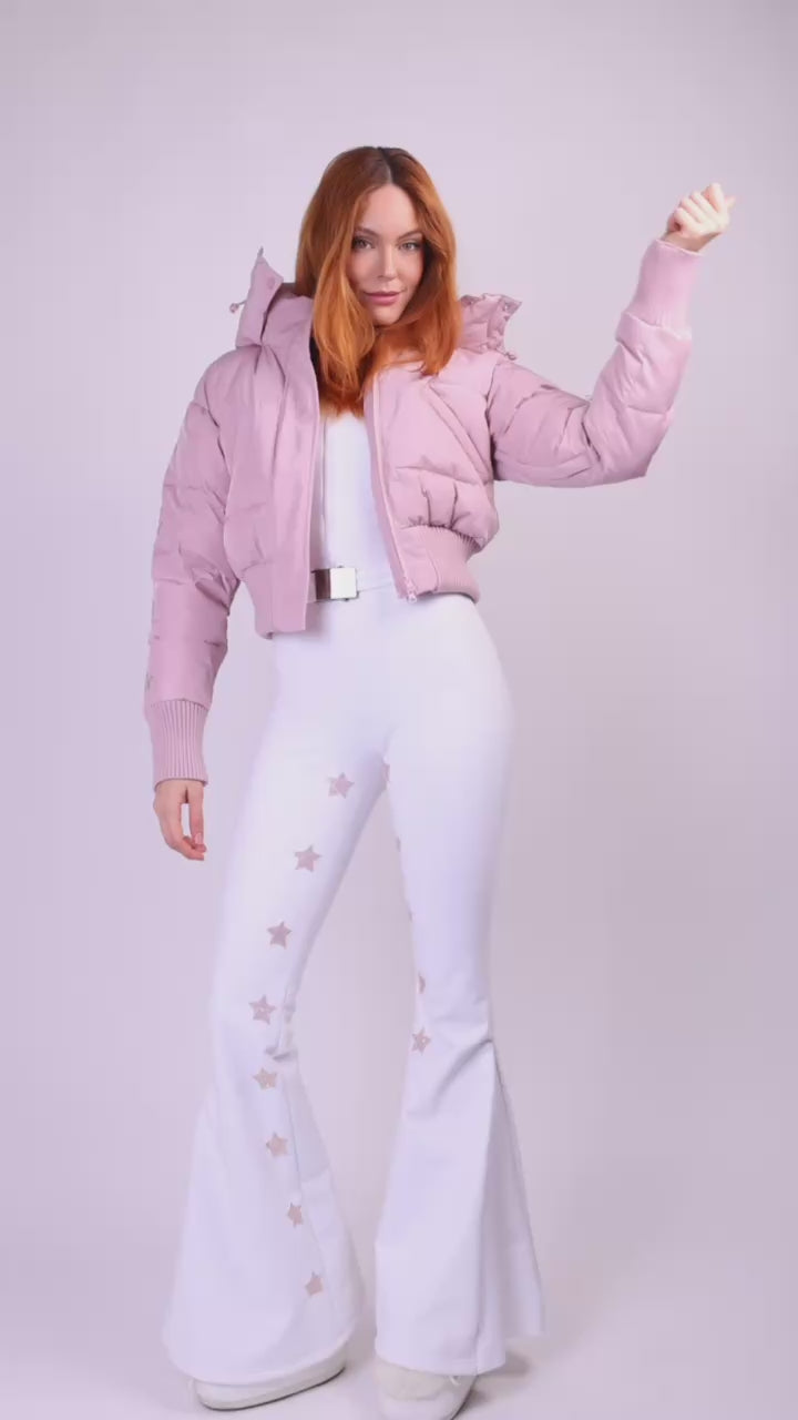Un piumino corto e avvolgente, pensato per brillare sulle piste e nei tuoi momenti di montagna. Realizzato in Italia in un pregiato tessuto tecnico idrorepellente, il Piumino Neve Rose unisce calore, femminilità ed estetica fashion-first, con l’immancabile tocco iconico delle stelle applicate a mano.