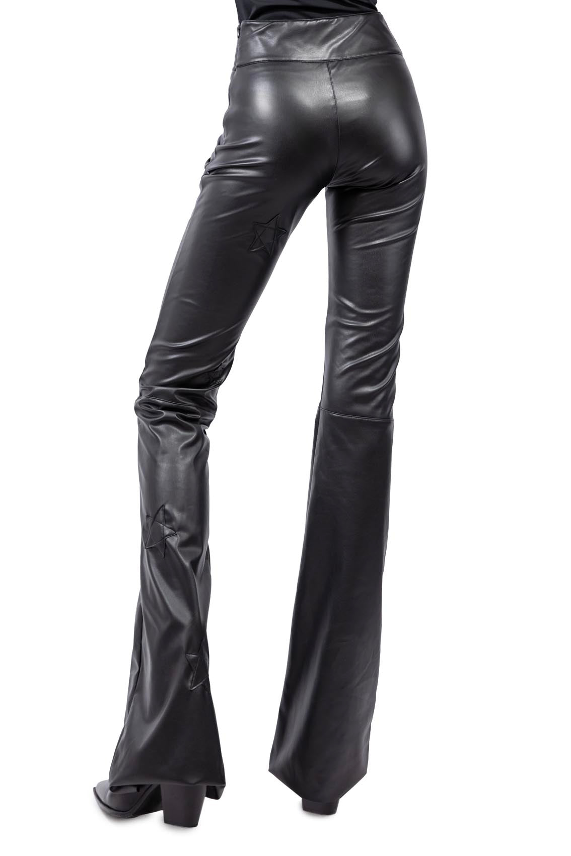 Pantalone in ecopelle elasticizzata nera, dal finish lucido ed elegante. La vestibilità aderente valorizza la silhouette, mentre le stelle applicate tono su tono donano carattere e unicità al capo. Perfetti per look da sera o outfit grintosi, da abbinare sia a top eleganti che a maglie oversize per uno stile più casual-chic.