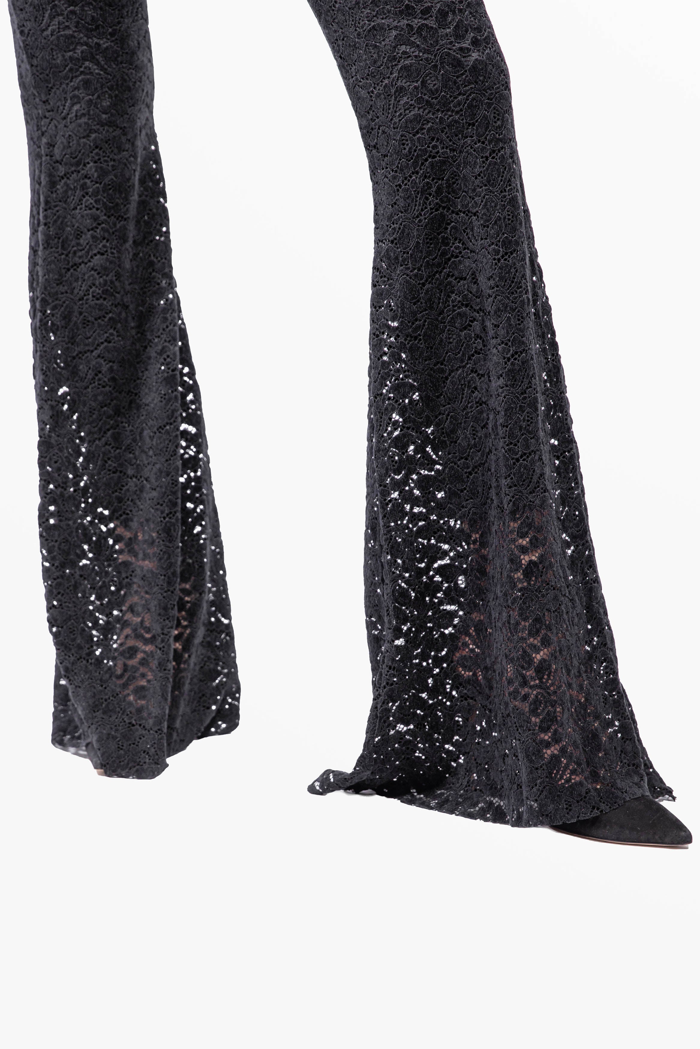 Flared trousers in stretch velvet lace – elegant and lightweight. Designed to elongate the figure, they create sophisticated sheer effects that enhance the silhouette.
