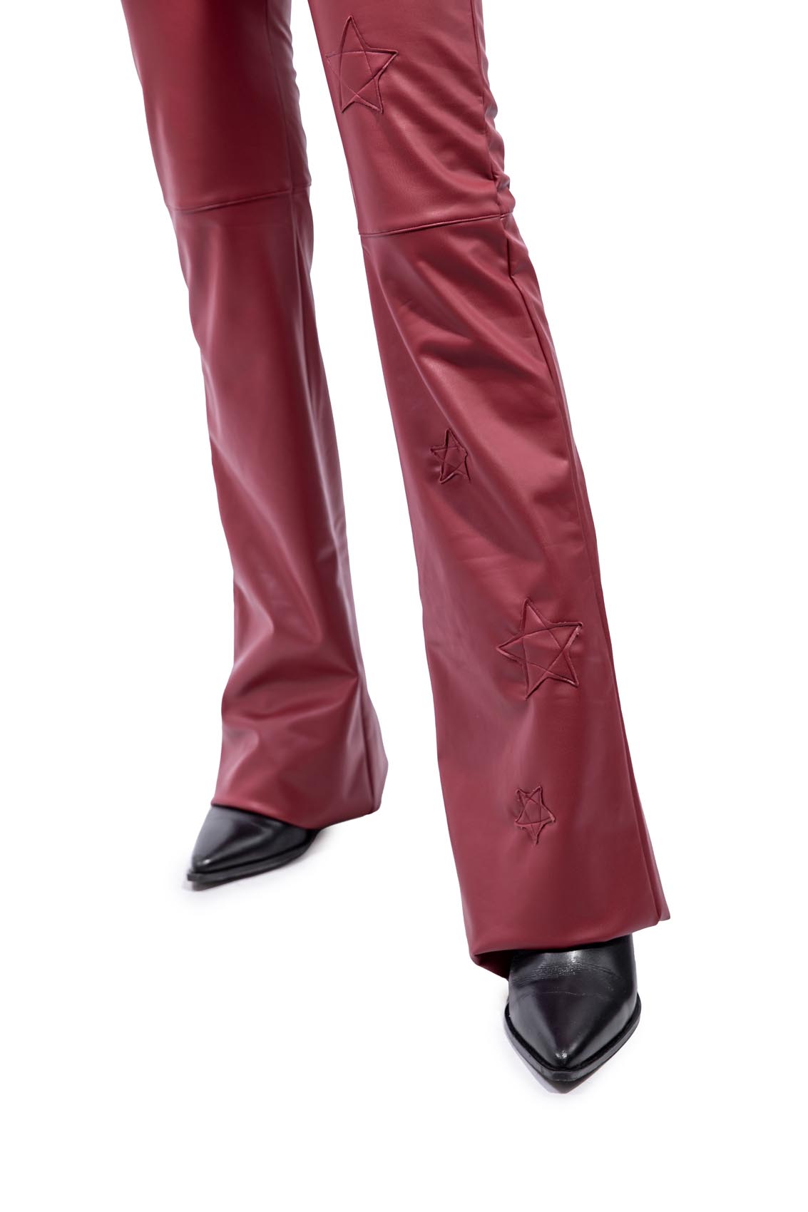Trousers in stretch eco-leather with a glossy, elegant finish. The slim fit enhances the silhouette, while the tone-on-tone star applications add character and uniqueness to the piece. Perfect for evening looks or bold outfits, easily paired with elegant tops or oversized sweaters for a casual-chic style.