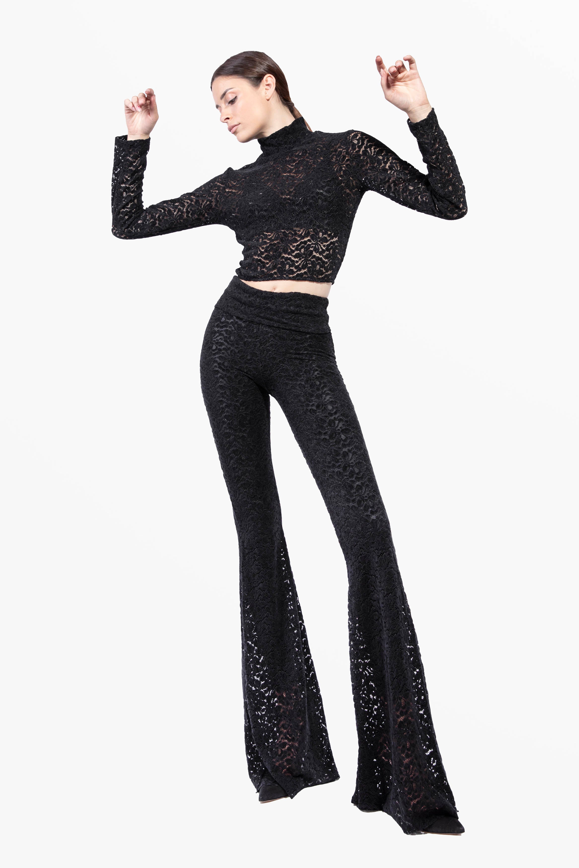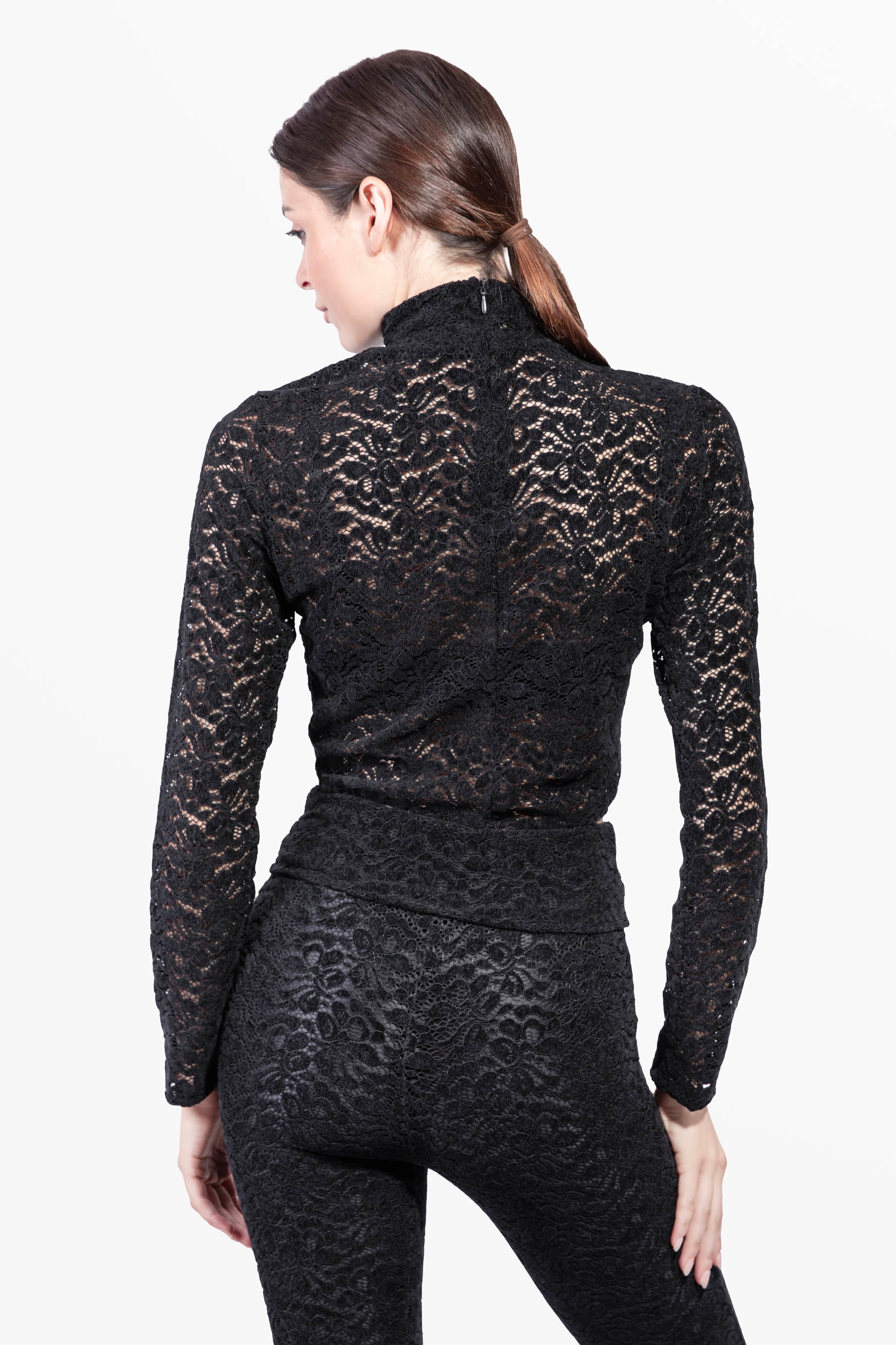 Lupetto a maniche lunghe in pizzo di velluto elasticizzato, con collo alto e trasparenze raffinate. Pensato per essere indossato sopra un top o da solo per un effetto sensuale e contemporaneo, si abbina facilmente a pantaloni, gonne o ai leggings coordinati.