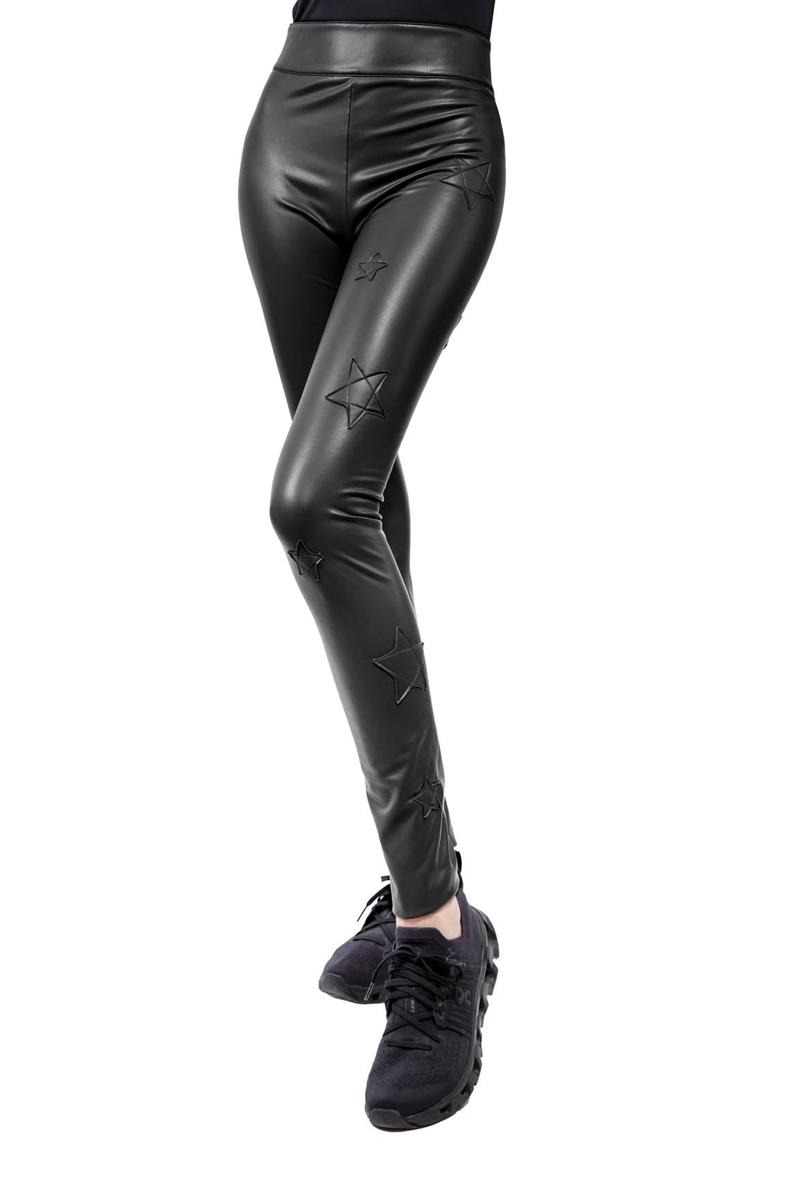 Leggings in ecopelle elasticizzata nera, dal finish lucido ed elegante. La vestibilità aderente valorizza la silhouette, mentre le stelle applicate tono su tono donano carattere e unicità al capo. Perfetti per look da sera o outfit grintosi, da abbinare sia a top eleganti che a maglie oversize per uno stile più casual-chic.