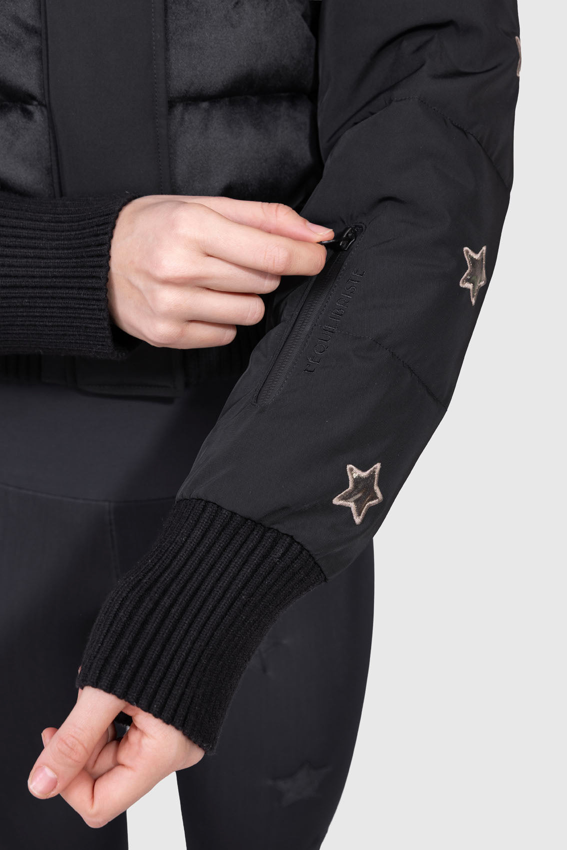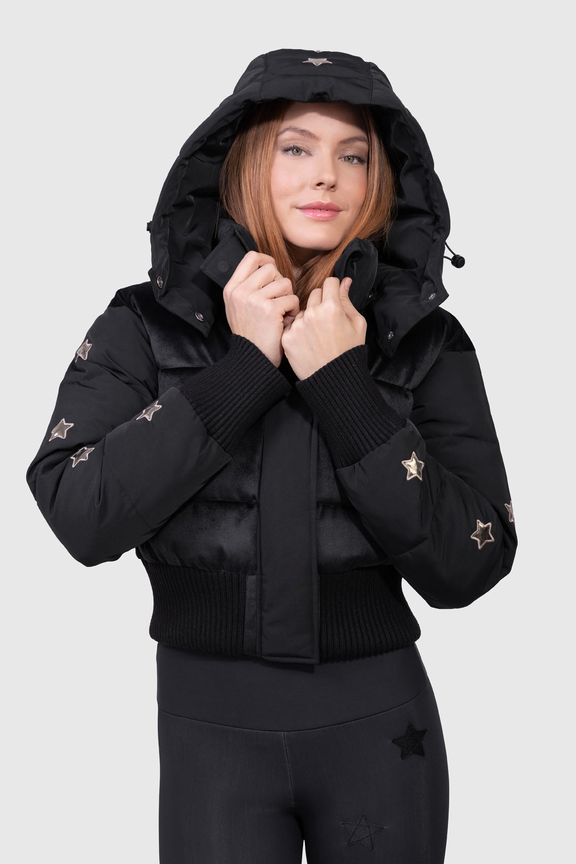 Un piumino corto e avvolgente, pensato per brillare sulle piste e nei tuoi momenti di montagna. Realizzato in Italia in un pregiato tessuto tecnico idrorepellente, unisce calore, femminilità ed estetica fashion-first, con l’immancabile tocco iconico delle stelle applicate a mano.