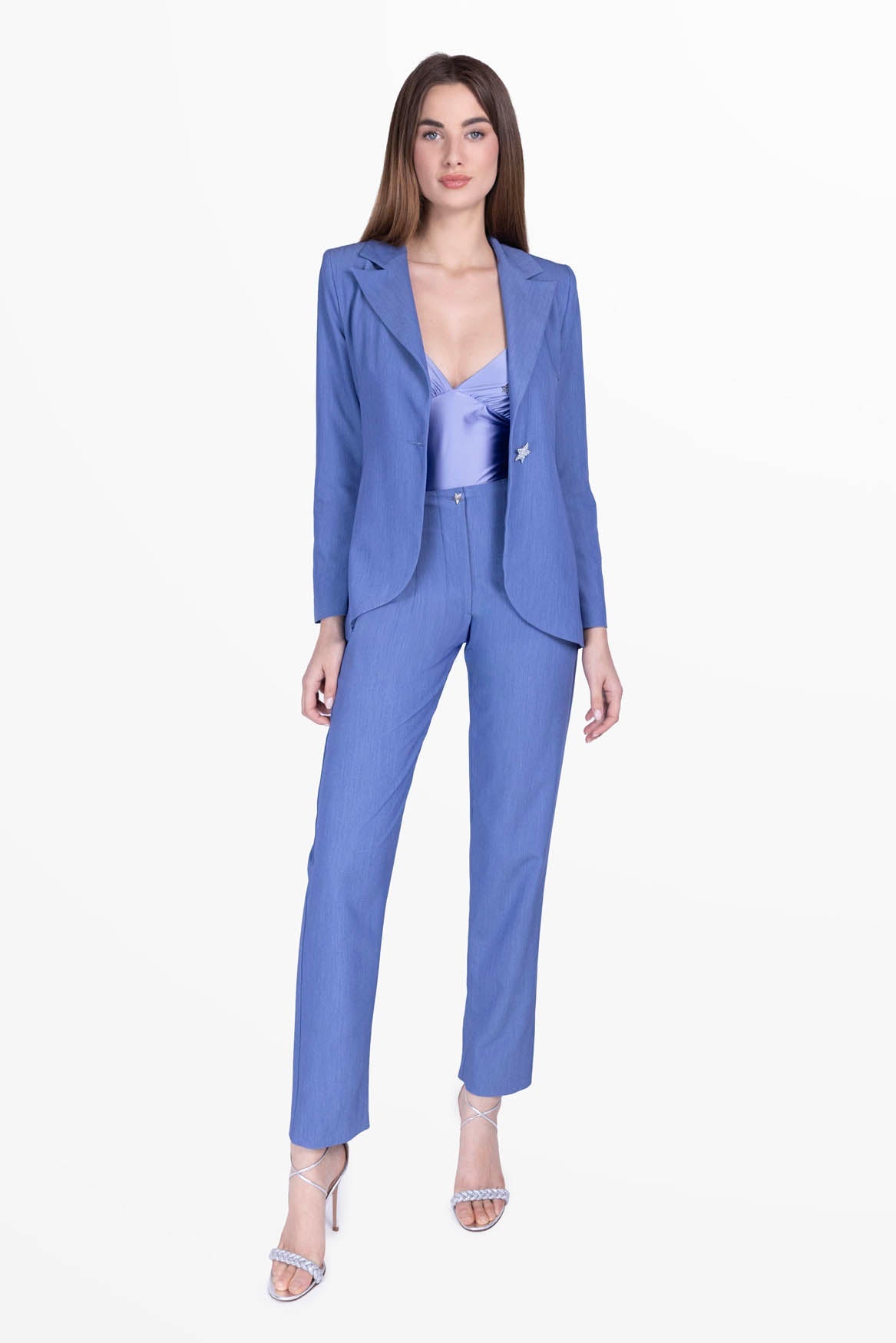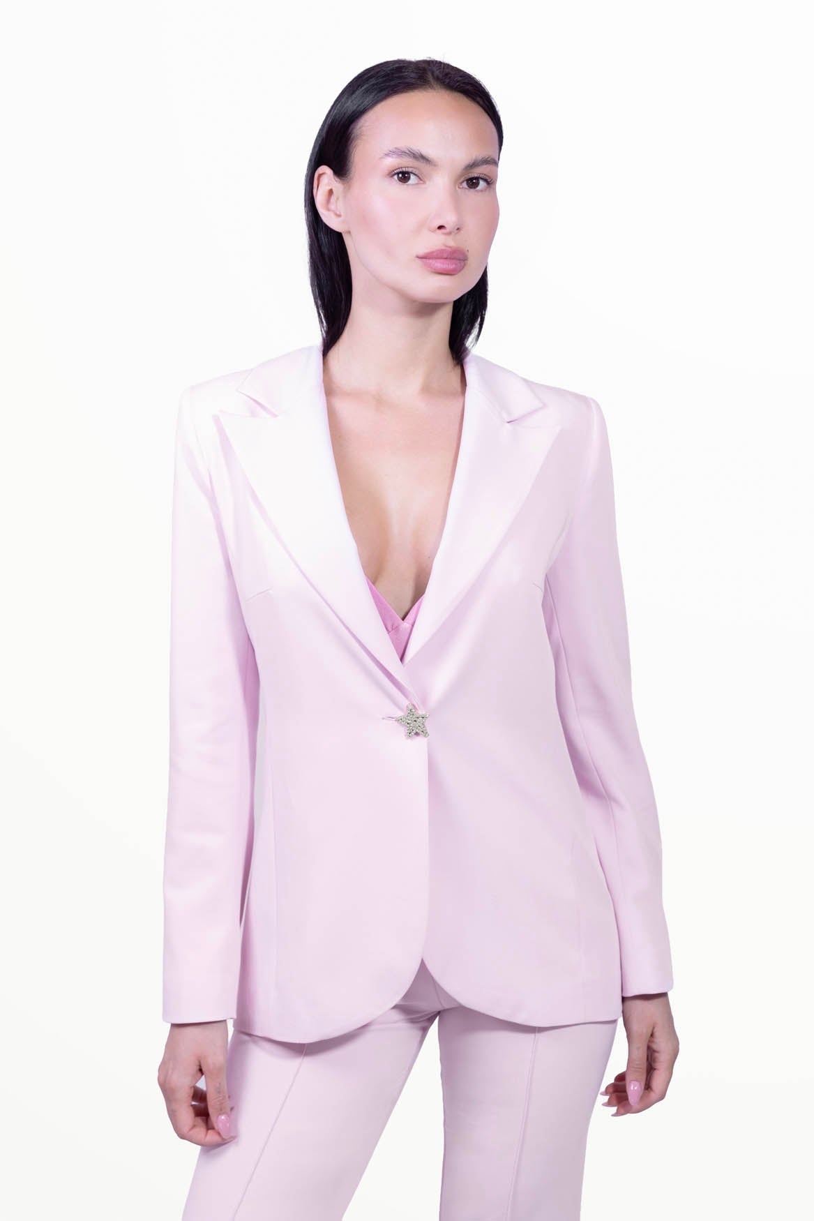 Women's blazer with a minimalist and modern design, satin collar, precious artisan star-shaped button.