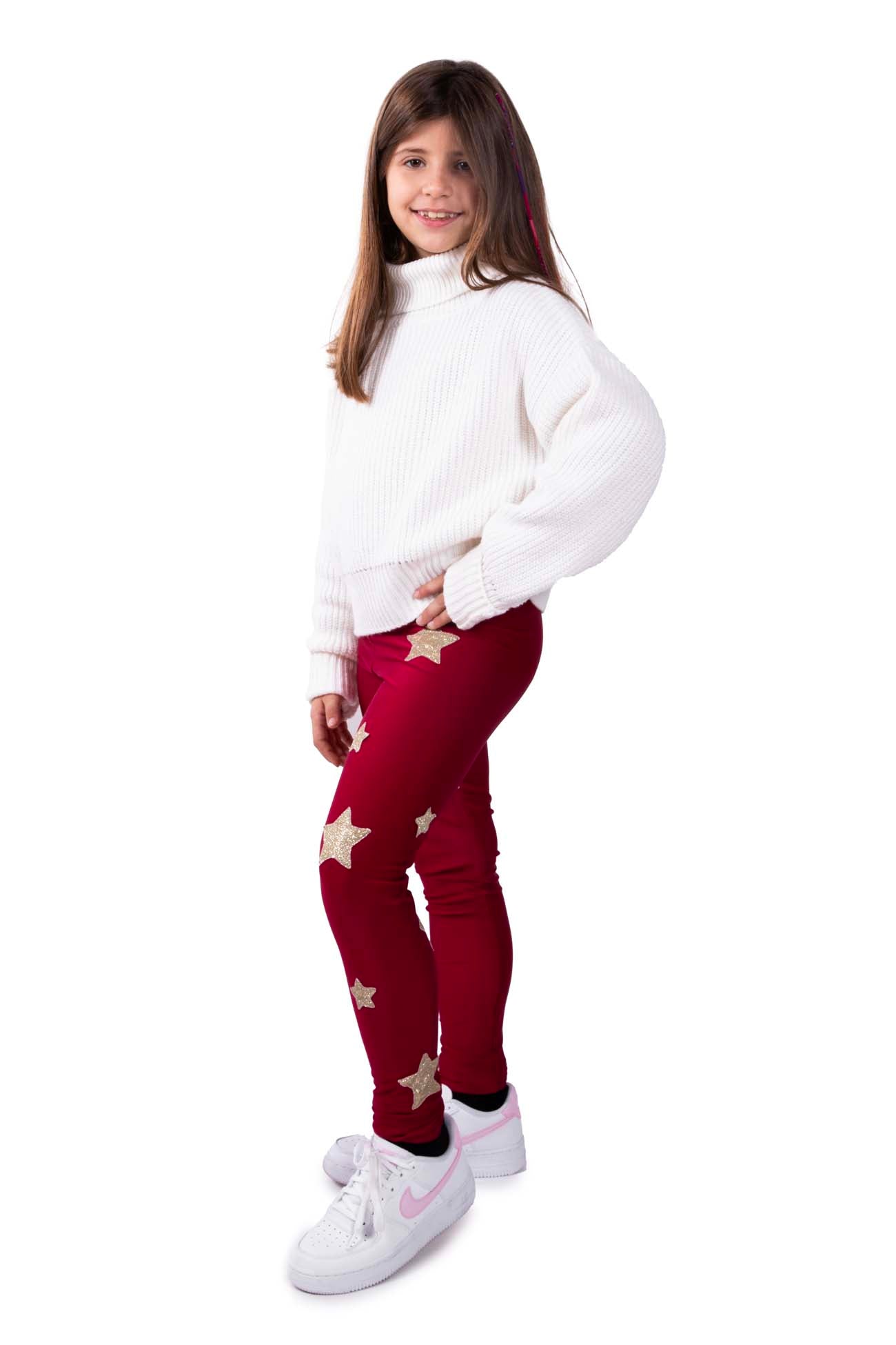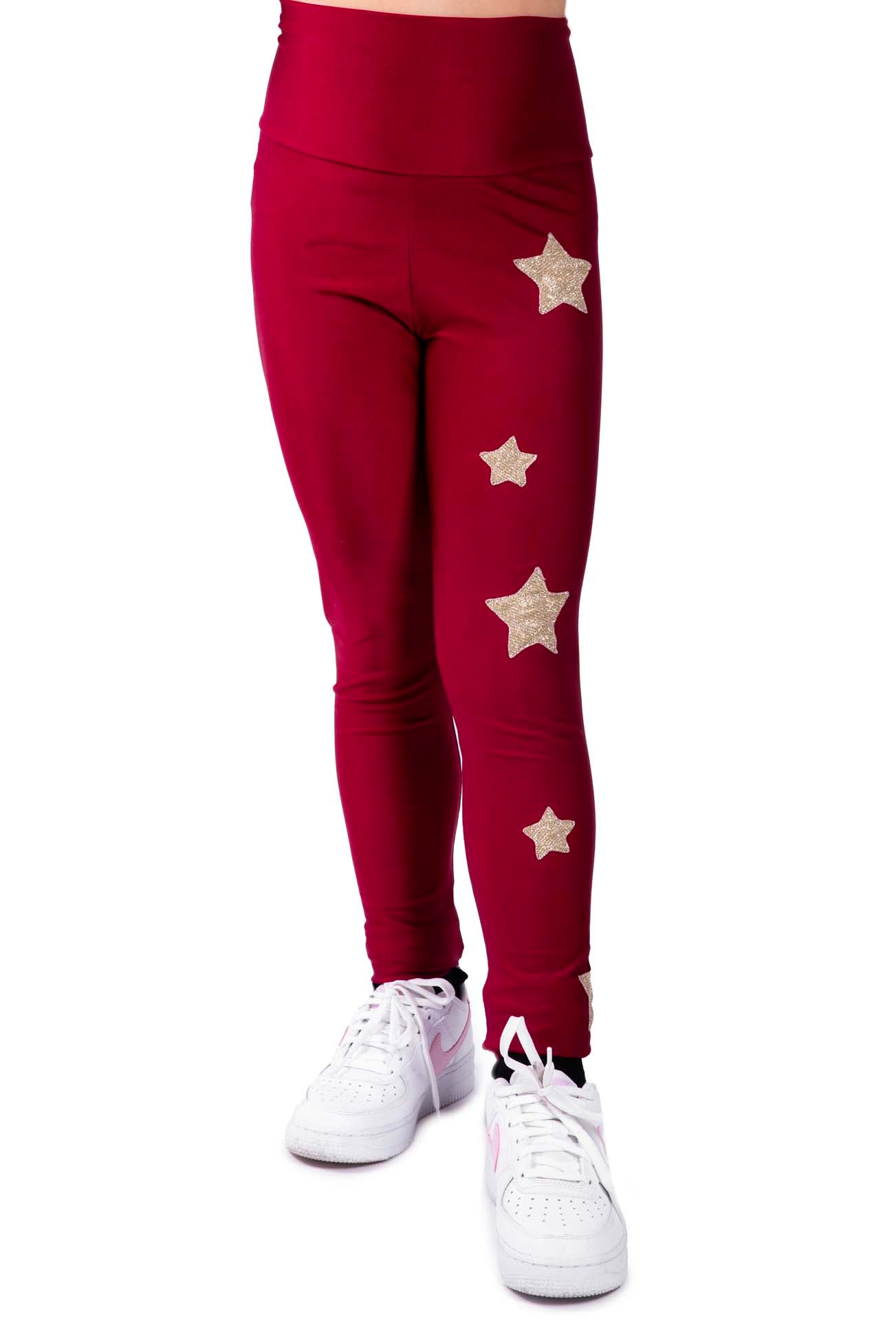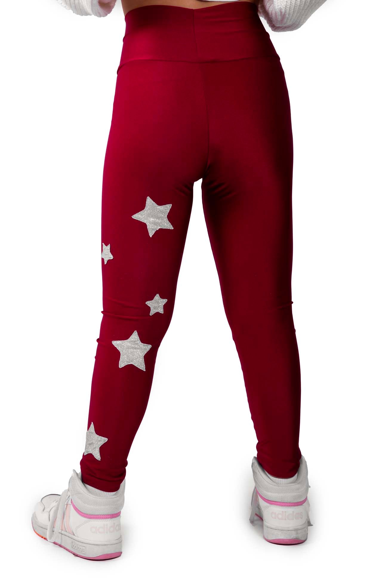 Leggings Bambina in lycra rosso scuro con stelle applicate rosse e argento, da abbinare con la versione donna.